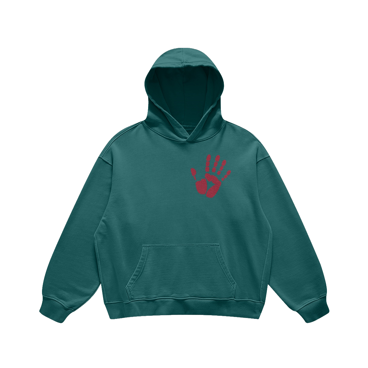 The First Mark features a bold, embroidered hand print, inspired by ancient cave art, a raw symbol of humanity’s earliest expression.